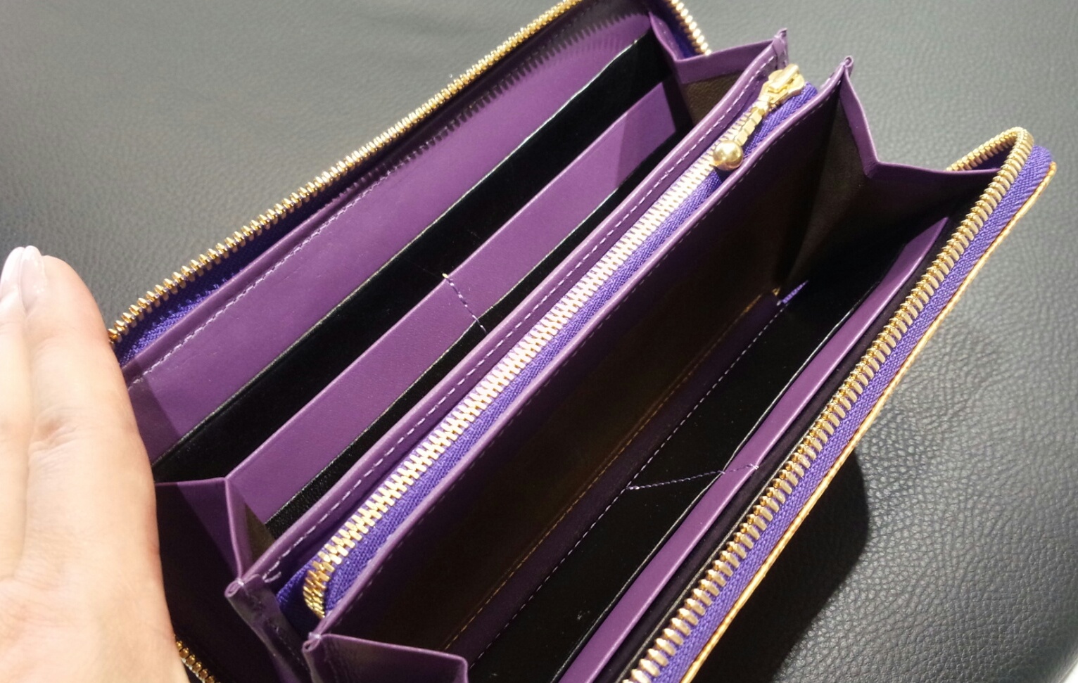 ホックを外すと、中にはお札入れ2個と、カードポケットは全体に8個があり、中央の小銭入れはL型ファスナーで中仕切りがあるタイプです。
