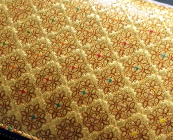黄金色に光輝く純金箔革に、伝統の花菱柄で型押し、